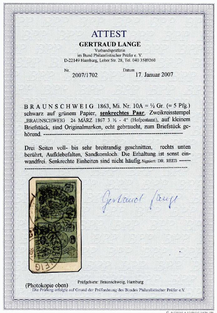 | Zusatzinformationen und Suchstichworte: | 230. Karl Pfankuch & Co Auktion 7. Dezember 2022 Los 152 Altdeutschland Braunschweig 1/2 Gr schwarz auf lebhaftgraugrün, senkrechtes Paar auf Prachtbriefstück, drei Seiten voll- bis sehr breitrandig, sauber gest. "BRAUNSCHWEIG 24. MÄRZ 1867", sign. Dr. Reeb und Fotoattest Lange, kl. Beeinträchtigungen. Senkrechte Einheiten dieses Wertes sind nicht häufig. Ausruf 300,00 EUR |