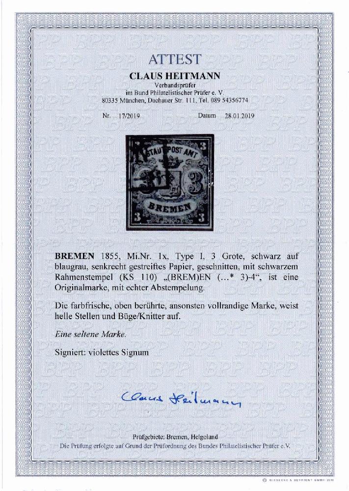| Zusatzinformationen und Suchstichworte: | 230. Karl Pfankuch & Co Auktion 7. Dezember 2022 Los 172 Altdeutschland Bremen 3 Gr schwarz auf blaugrau, x-Papier, sauber gest., allseits vollrandig, violettes Signum und Fotoattest Heitmann, helle Stellen und Büge/Knitter. M€ 750.- Eine seltene Marke! Zuschlag 54,00 EUR |