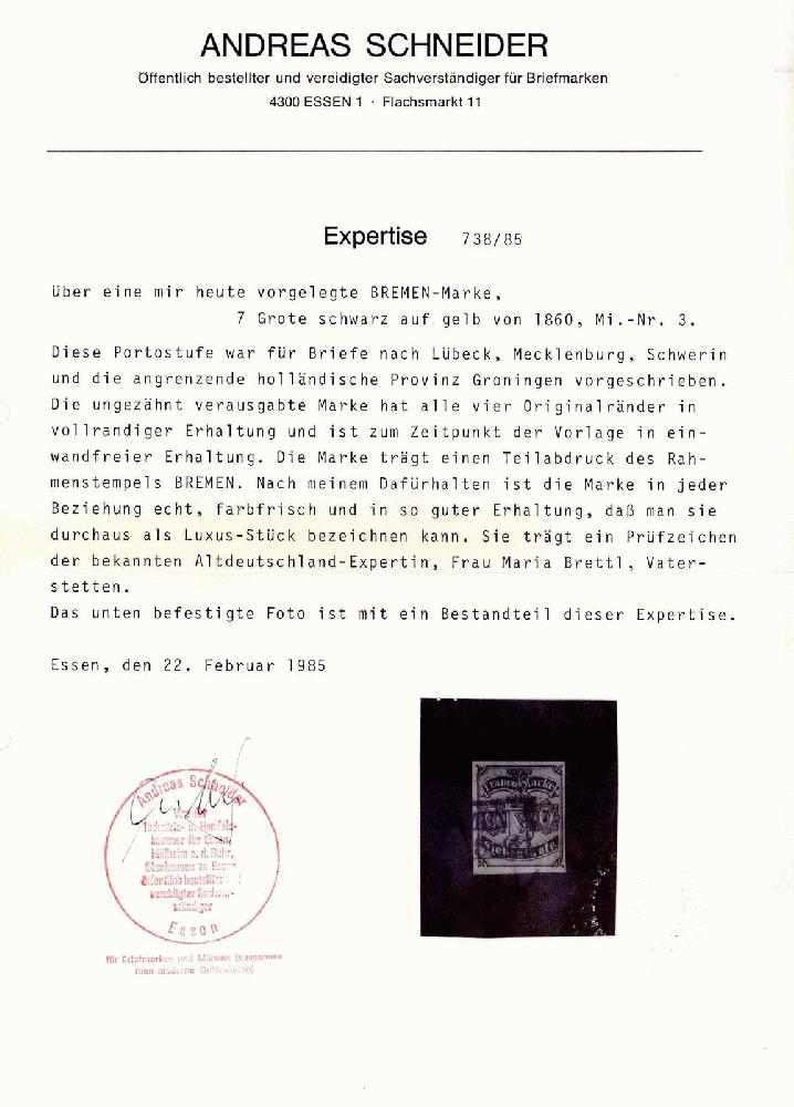 | Zusatzinformationen und Suchstichworte: | 230. Karl Pfankuch & Co Auktion 7. Dezember 2022 Los 174 Altdeutschland Bremen 7 Grote schw. auf gelb, farbfrisches, vollrandiges Luxusstück mit Ra2 "BREMEN", sign. Brettl und Expertise Schneider. M€ 900.- Zuschlag 290,00 EUR |