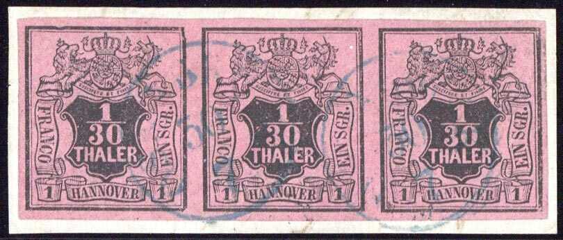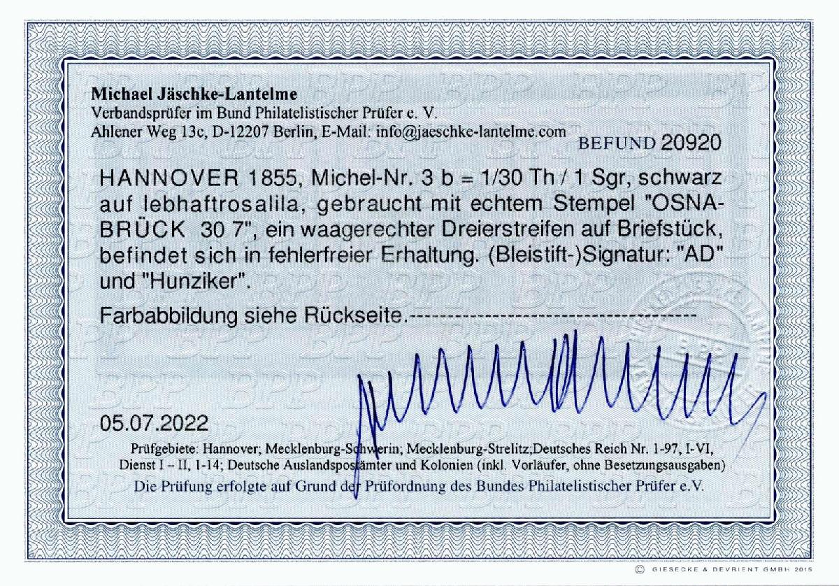 | Zusatzinformationen und Suchstichworte: | 230. Karl Pfankuch & Co Auktion 7. Dezember 2022 Los 213 Altdeutschland Hannover 1/30 Th schwarz auf lebhaftrosalila, waagerechter Dreierstreifen, voll- breitrandig auf Kabinettbriefstück mit K1 "OSNABRÜCK 30 7", Signaturen "AD" und "Hunziker" sowie aktueller Fotobefund J.-Lantelme, fehlerfreie Erhaltung. Blickfang! Zuschlag 130,00 EUR |