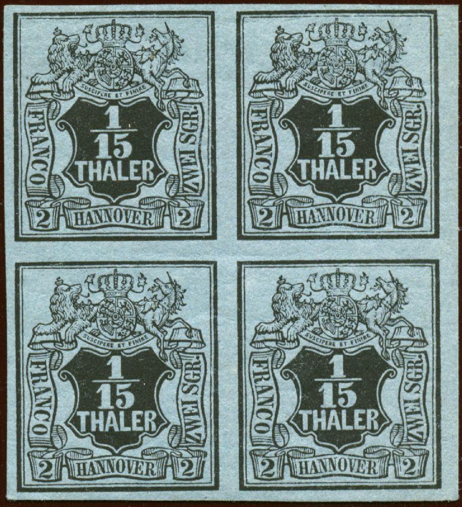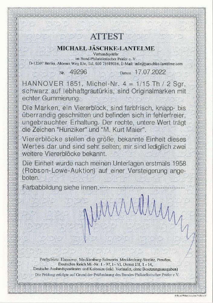 | Zusatzinformationen und Suchstichworte: | 230. Karl Pfankuch & Co Auktion 7. Dezember 2022 Los 216 Altdeutschland Hannover 1/15 Th schwarz auf lebhaftgrautürkis, Viererblock, knapp- bis überrandig geschnitten in fehlerfreier ungebrauchter Erhaltung * mit echter Gummierung, der rechte untere Wert mit Zeichen "Hunziker" und "M. Kurt Maier" sowie aktuelles Fotoattest J.-Lantelme. Viererblöcke stellen die größte bekannte Einheit dieses Wertes dar, es sind nur zwei weitere Viererblöcke bekannt. Die Hannover-Rarität wurde erstmal 1958 (Robson-Lowe-Auktion) auf einer Versteigerung angeboten. Zuschlag 2.400,00 EUR |