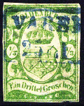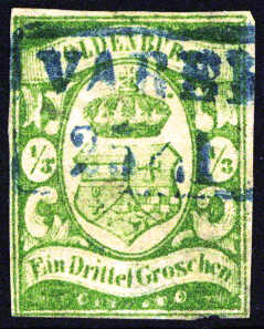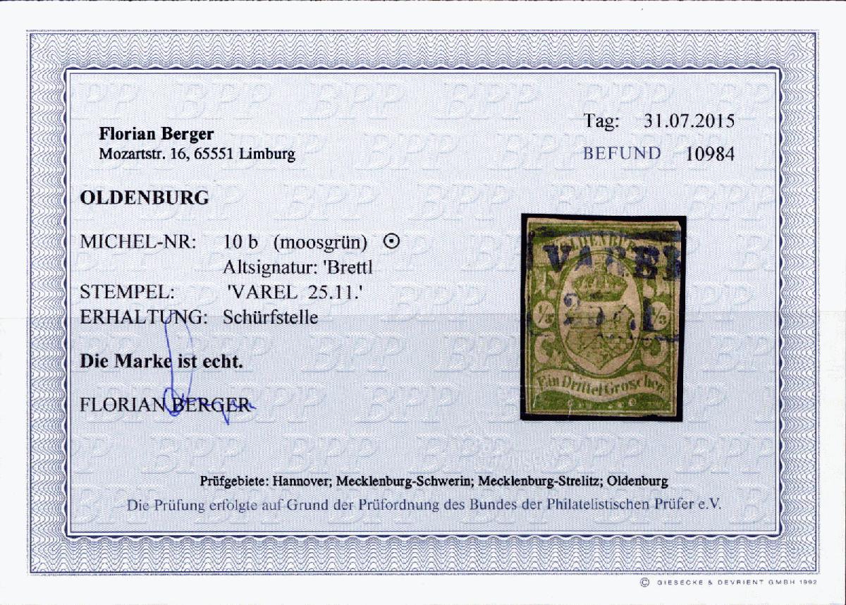 | Zusatzinformationen und Suchstichworte: | 230. Karl Pfankuch & Co Auktion 7. Dezember 2022 Los 367 Altdeutschland Oldenburg 1/3 Gr. dunkelgelbgrün, hervorragend farbfrisches Exemplar, vollrandig geschnitten und mit klarem, blauem R2 VAREL (rs. Aufrauhung), sign. Brettl, Fotobefund Berger BPP. M€ 3.000.- Ausruf 300,00 EUR |