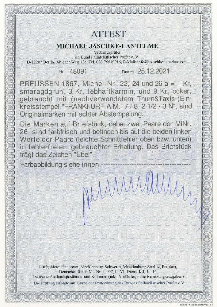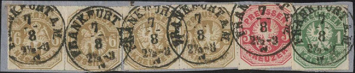 | Zusatzinformationen und Suchstichworte: | 230. Karl Pfankuch & Co Auktion 7. Dezember 2022 Los 502 Altdeutschland Preussen 1 Kr. grün und 3 Kr. karmin nebst zwei waager. Paaren 9 Kr. ockerbraun auf dekor. Briefstück mit K1 "FRANKFURT A.M.", eine besonders seltene 40-Kreuzer-Dreifarben-Kombination, zwei 9 Kr. kl. Durchstichfehler, Attest Jäschke-L. Zuschlag 270,00 EUR |