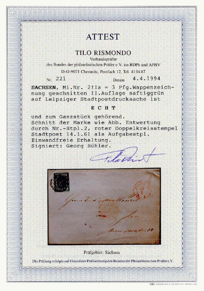 | Zusatzinformationen und Suchstichworte: | 230. Karl Pfankuch & Co Auktion 7. Dezember 2022 Los 627 Altdeutschland Sachsen 3 Pf saftiggrün 2. Auflage, zwei Seiten breitrandig, sauber auf Ortsbrief (Stadtpost) aus Leipzig vom 14.1., enthaltend eine Einladung von Pianist Isidor Seiss zu einer Matinée, Fotoattset Rismondo "echt und einwandfrei". Seiss war ein bedeutender deutscher Komponist, Dirigent, Pianist und Klavierpädagoge. Zu seinen bekanntesten Schülern gehörten Elly Ney und Engelbert Humperdinck. Zuschlag 250,00 EUR |