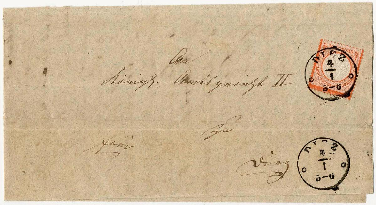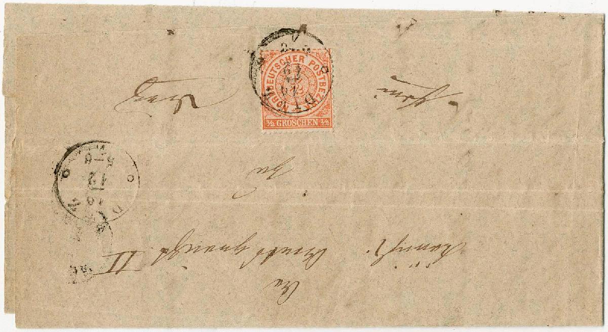 | Zusatzinformationen und Suchstichworte: | 230. Karl Pfankuch & Co Auktion 7. Dezember 2022 Los 851 Deutsches Reich NDP 1/2 Gr orange gezähnt sowie 1/2 Gr ziegelrot kl. Schild, auf doppelt verwendetem Brief (Hü) im eigenen Landzustellbereich innerhalb Dietz mit Taxis-K1 vom 19.12. (1871) bzw. 4.1. (1872), beide Marken in sehr guter Erhaltung, die Falthülle mit deutlichen Gebrauchs- und Altersspuren, Fotoattest Brugger. Eine sehr seltene Verwendung in der Übergangszeit NDP-DR! Zuschlag 225,00 EUR |