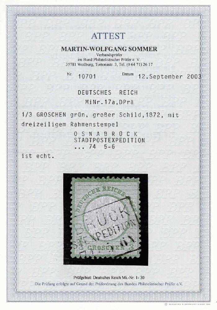 | Zusatzinformationen und Suchstichworte: | 230. Karl Pfankuch & Co Auktion 7. Dezember 2022 Los 872 Deutsches Reich, 1872 Grosser Brustschild 1/3 Gr grün gr. Schild, gut zentriert, Zähnung teils unregelmäßig, Doppelprägung (ca. 1,1 mm nach links), sauber gest. "OSNABRÜCK ...74", Fotoattest Sommer, gutes Bedarfsstück. M€ 1.000.- Ausruf 180,00 EUR |