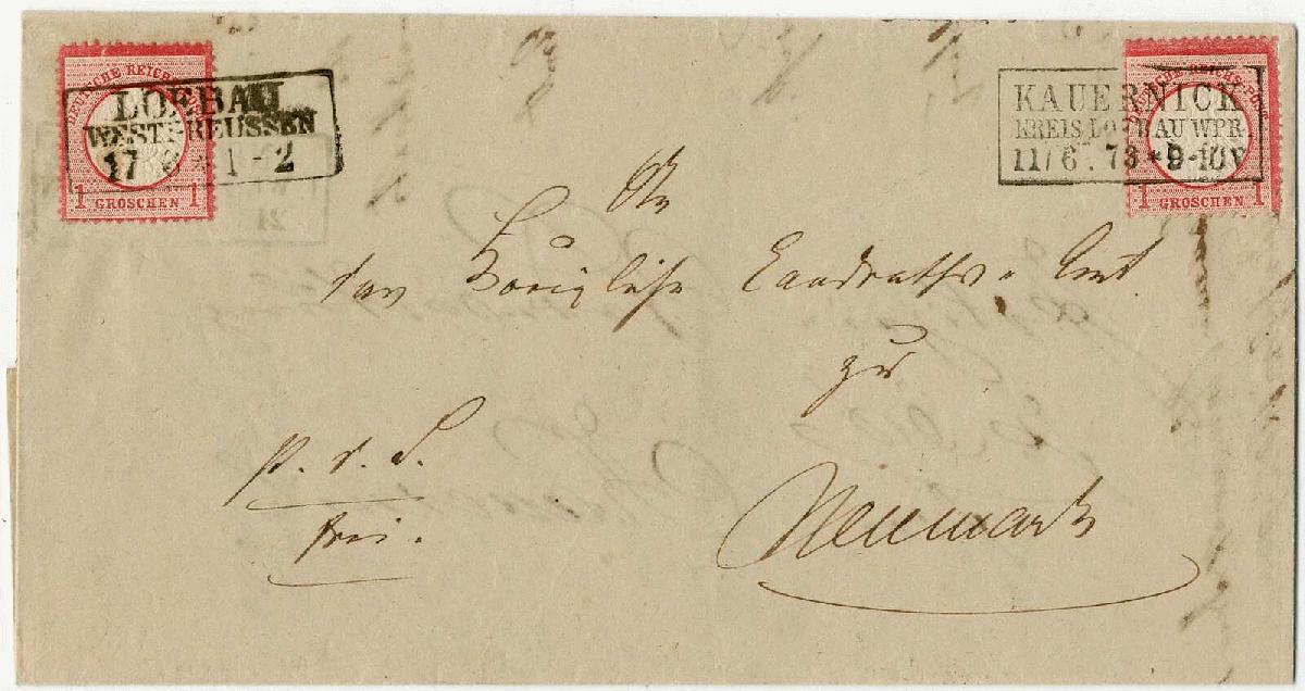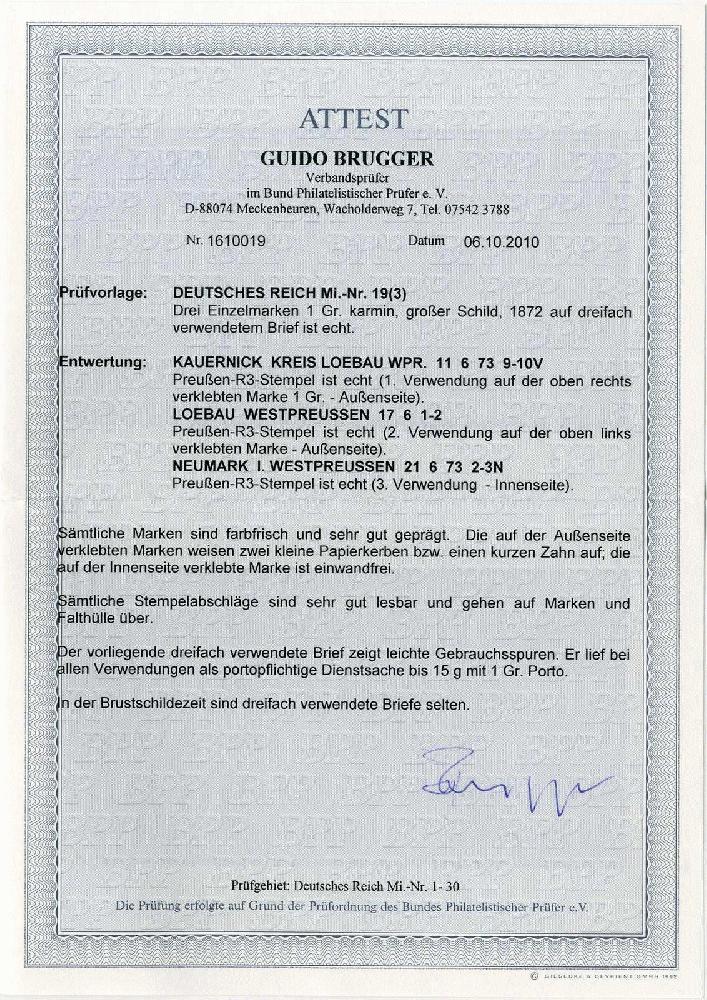 | Zusatzinformationen und Suchstichworte: | 230. Karl Pfankuch & Co Auktion 7. Dezember 2022 Los 885 Deutsches Reich, 1872 Grosser Brustschild 1873, dreifach verwendeter Brief mit 3 x 1 Gr großer Schild (1 x innen), mit den Aufgabestempeln "KAUERNICK KREIS LOEBAU WPR. 11 6 73", "LOEBAU WESTPREUSSEN 17 6" und "NEUMARK I.WESTPREUSSEN 21 6 73", je Preusen Ra3, die Marke innen einwandfrei, die beiden Marken außen kl. Beeinträchtigungen, Fotoattest Brugger, ein seltener Beleg. Ausruf 150,00 EUR |