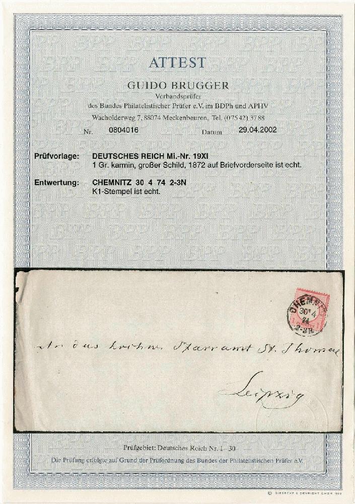 | Zusatzinformationen und Suchstichworte: | 230. Karl Pfankuch & Co Auktion 7. Dezember 2022 Los 887 Deutsches Reich, 1872 Grosser Brustschild 1 Gr karmin mit Plattenfehler XI und zusätzlich markantem sichelförmigen Schraubenkopfabdruck (Feld 150), farbfrisch, erkennbar geprägt und gut gezähnt auf Briefvorderseite mit K1 "CHEMNITZ 30 4 74", Fotoattest Brugger. Ausruf 60,00 EUR |