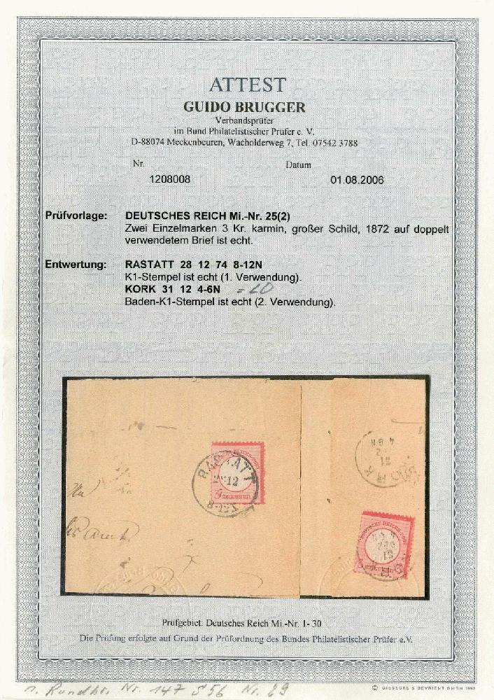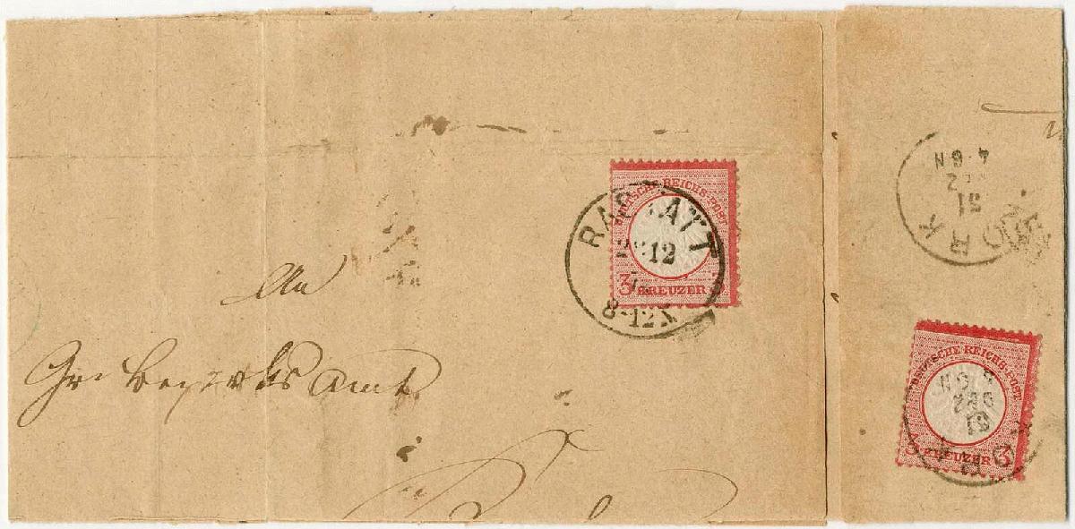 | Zusatzinformationen und Suchstichworte: | 230. Karl Pfankuch & Co Auktion 7. Dezember 2022 Los 900 Deutsches Reich, 1872 Grosser Brustschild 31.12.1874, Letzttagsverwendung der Kreuzerwerte, doppelt verwendeter Brief (deutliche Gebbrauchsspuren, mehrfach angetrennt) mit 3 Kr aus "RASTATT 28.12.1874" nach Kork und von dort mit weiterer 3 Kr-Marke und K1 "KORK 31.12.1874" nach Leutesheim, Post Kehl, erstverwendete 3 Kr-Marke Knitter, Fotoattest Brugger, Brustschilde-Seltenheit! Ausruf 200,00 EUR |