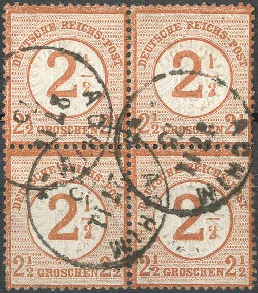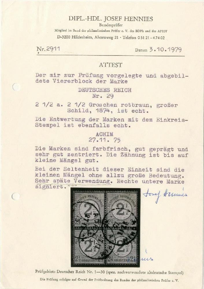 | Zusatzinformationen und Suchstichworte: | 230. Karl Pfankuch & Co Auktion 7. Dezember 2022 Los 906 Deutsches Reich, 1872 Grosser Brustschild 2 1/2 auf 2 1/2 Gr rotbraun, Viererblock, farbfrisch, sehr gut zentriert und gut geprägt, die Zähnung ist bis auf kl. Mängel gut, sauber gest. "ACHIM 27 11 75", Fotoattest Hennies, Pracht. M€ 850.- Zuschlag 135,00 EUR |
