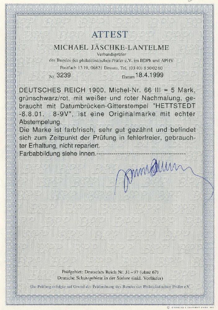 | Prüfer: | Jäschke-Lantelme, Michael (BPP (Bund Philatelistischer Prüfer)) |