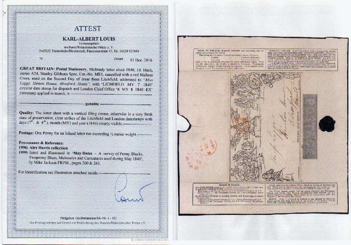 | Zusatzinformationen und Suchstichworte: | Mulready-Faltbrief vom zweiten Verwendungstag, in der Provinz verwendet. 1996 Alex-Harris-Collection 1999: In "May Dates -..." von Mike Jackson FRPSL auf S. 260/1. |