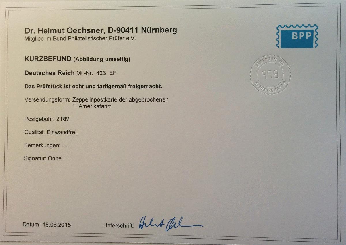 | Prüfgebiet: | Deutsches Reich Zeppelinpost (Belege) |