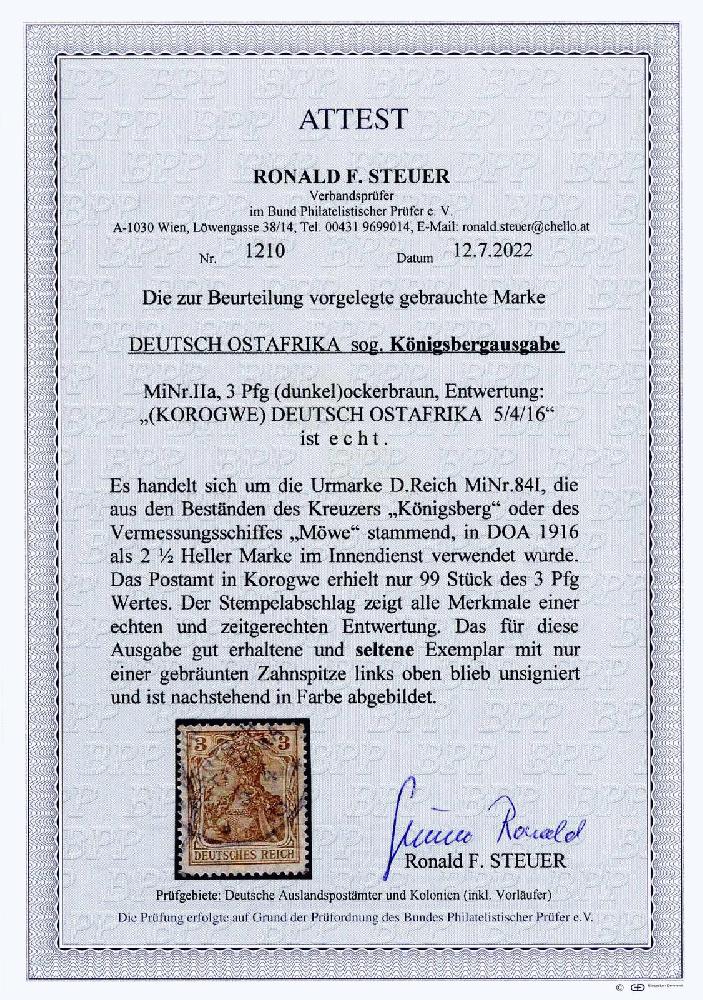| Zusatzinformationen und Suchstichworte: | 230. Karl Pfankuch & Co Auktion 7. Dezember 2022 Los 1902 Deutsche Kolonien Ostafrika 3 Pf (= 2 1/2 Pf) Königsbergausgabe 1916, Urmarke DR Nr. 84 I aus den Beständen des Kreuzers "Königsberg" bzw. aus dem Vermessungsschiff "Möwe" stammend, auf Grund des durch den 1.WK in den Schutzgebieten entstandenen Markenengpasses im Innendienst ausholfsweise aufgebraucht, hier mit Stpl. "KORGOWE DEUTSCH-OSTAFRIKA 5 4 16", sign. Müller-Mark, Köhler und aktuelles Fotoattest Steuer. Äußerst selten, das Postamt in Korgowe erhielt lediglich 99 Stück des 3 Pf-Wertes, laut Attest ein für diese Ausgabe gut erhaltenes Exemplar mit nur einer gebräunten Zahnspitze. Kaum einmal angebotene Ausgabe! M€ 4.000.- Zuschlag 1.250,00 EUR |