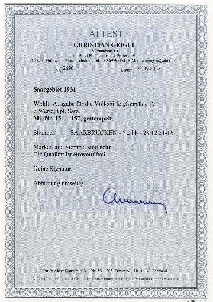 | Zusatzinformationen und Suchstichworte: | 230. Karl Pfankuch & Co Auktion 7. Dezember 2022 Los 2068 Saar Volkshilfe 1931, sauber gest., aktuelles Fotoattest Geigle, "echt und einwandfrei". M€ 800.- Zuschlag 190,00 EUR |