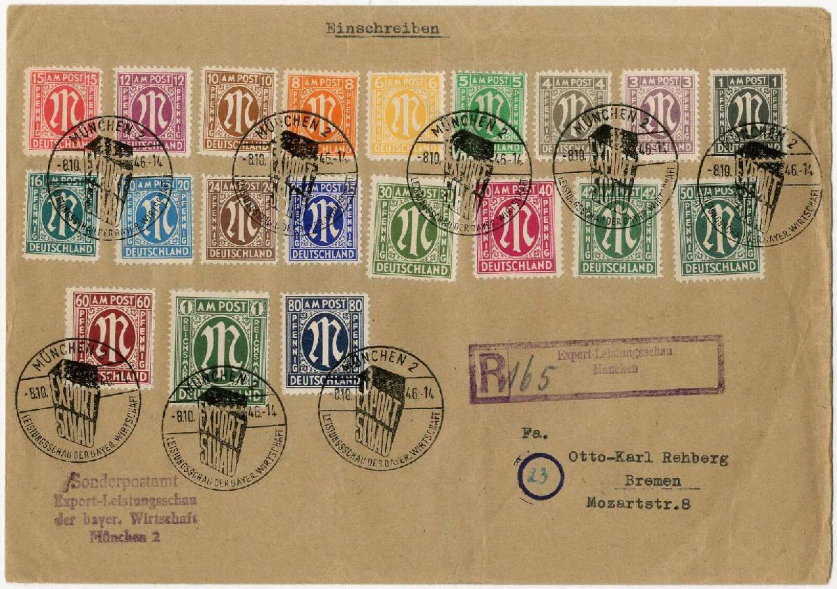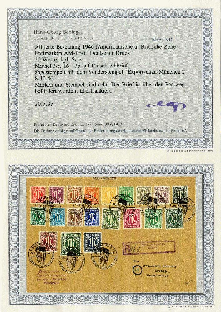 | Zusatzinformationen und Suchstichworte: | 230. Karl Pfankuch & Co Auktion 7. Dezember 2022 Los 1183 Bizone AM-Post deutscher Druck, kpl. Satz 1 Pf bis 1 RM auf dekorativem Sammler-R-Brief mit SST "MÜNCHEN 8.10.46" nach Bremen mit rücks. Ankunftsstpl., Fotobefund Schlegel Ausruf 200,00 EUR |