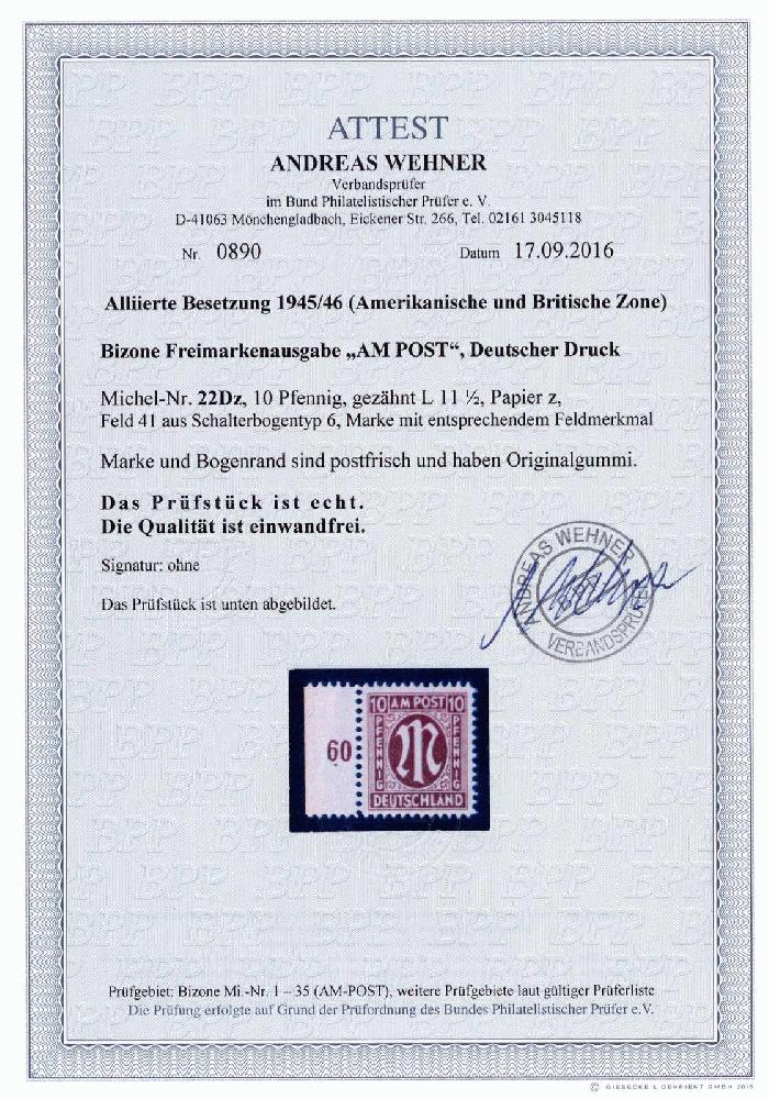 | Zusatzinformationen und Suchstichworte: | 230. Karl Pfankuch & Co Auktion 7. Dezember 2022 Los 1185 Bizone 10 Pf AM-Post Dz-Type, Seitenrandstück, tadellos **, Fotoattest Wehner "echt und einwandfrei". Ausruf 120,00 EUR |