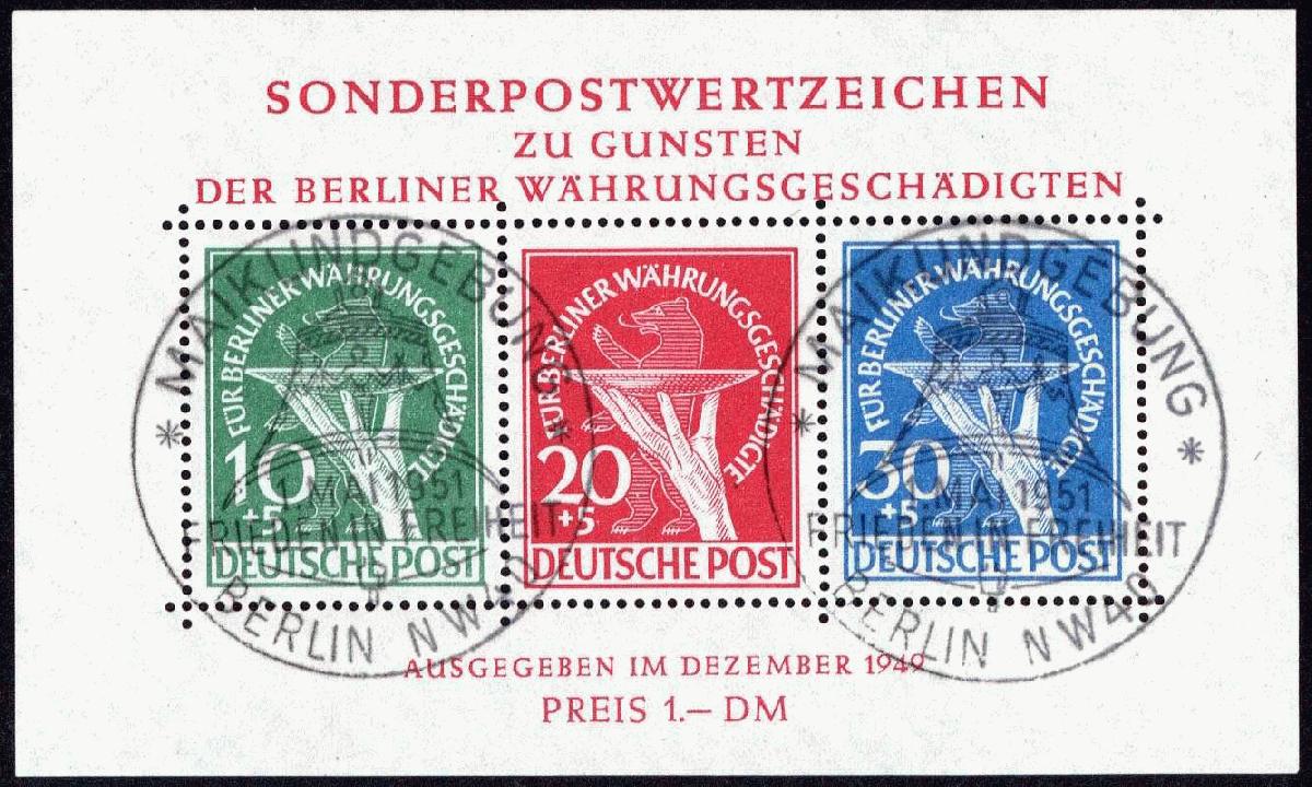 | Zusatzinformationen und Suchstichworte: | 230. Karl Pfankuch & Co Auktion 7. Dezember 2022 Los 1460 Berlin Währungsblock 1949, sauber mit vollständiger Originalgummierung und zwei sauberen SST-Abschlägen "Maikundgebung 1.Mai 1951", Fotoattest Schlegel "echt und einwandfrei", Luxus. M€ 2.200.-+ Zuschlag 460,00 EUR |