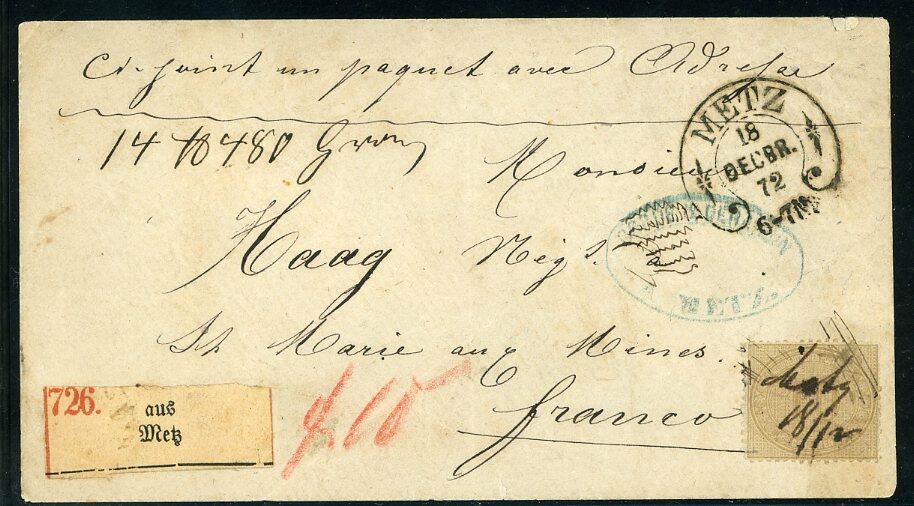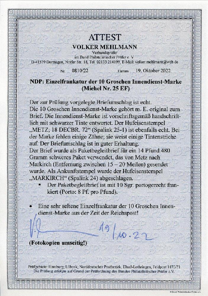 | Zusatzinformationen und Suchstichworte: | 25. Briefmarkenhandel Dessau Auktion 28. Dezember 2022 Los 90 Altdeutschland Norddeutscher Postbezirk Innendienstmarke 10 Gr. mittelbraungrau als seltene Einzelfrankatur mit handschriftlicher Entwertung "Metz 18/12" und darüber gesetztem Hufeisenstempel "METZ 18.DECBR.72" auf Paketbegleitbrief nach Markirch. Brief aus über 50 Jahre unberührtem Sammler-Nachlass in guter Erhaltung, Mke. kleine Zahnfehler, unerheblich bei dieser seltenen Frankatur aus der Zeit der Reichspost, aktuelles Foto-Attest Mehlmann BPP Ausruf 800,00 EUR |