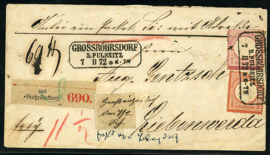 | Zusatzinformationen und Suchstichworte: | 25. Briefmarkenhandel Dessau Auktion 28. Dezember 2022 Los 91 Altdeutschland Norddeutscher Postbezirk Innendienstmarke 10 Pfg. hellbraungrau mit handschriftlicher Entwertung "Großröhrsdorf den 7/2" in Mischfrankatur mit DR Kleinem Brustschild ½ Gr. zinnober (rechte obere Ecke schräg) und 1 Gr. karmin als Dreifarbenfrankatur auf Paketbegleitbrief mit Sachsen-Ra3 "GROSSRÖHRSDORF 7 II 72", adressiert nach Liebenwerda, rücks. Ausg.-Stpl., Brief aus über 50 Jahre unberührtem Sammler-Nachlass mit übl. Beförderungsspuren, aktueller Foto-Befund Jäschke-Lantelme BPP Ausruf 250,00 EUR |