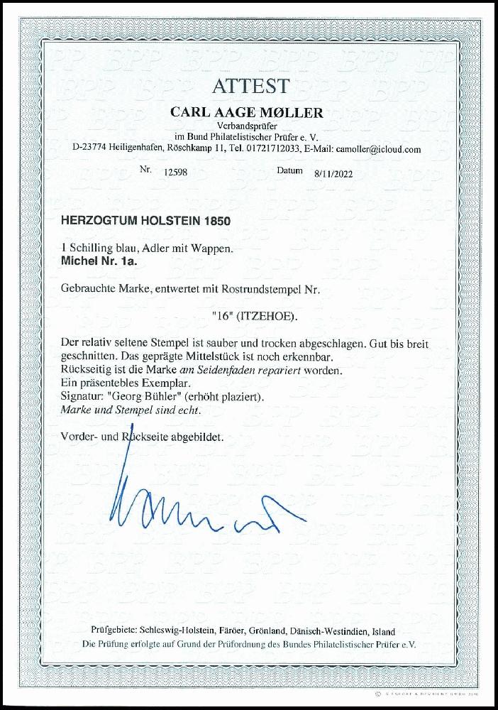 | Zusatzinformationen und Suchstichworte: | Dr. Reinhard Fischer 190. Auktion 27. - 28. Januar 2023 Los 8 Altdeutschland Schleswig Holstein 1 Schilling blau, voll- bis breitrandig geschnittenes Exemplar der seltenen Marke, entwertet mit relativ seltenem Rostrundstempel "16" - Itzehoe, rückseitig am Seidenfaden repariert, Fotoattest Carl Aage Moeller BPP (2022): "Ein repräsentables Exemplar.", Mi. 6.000.- Ausruf 500,00 EUR |