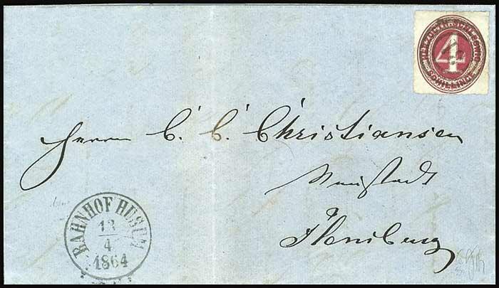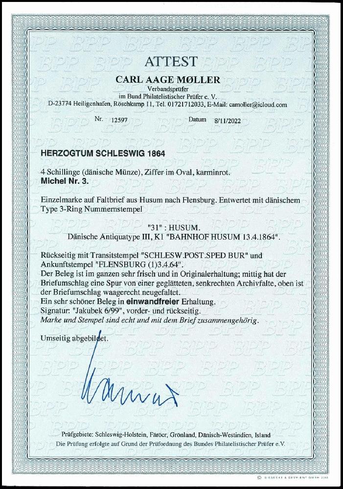 | Zusatzinformationen und Suchstichworte: | Dr. Reinhard Fischer 190. Auktion 27. - 28. Januar 2023 Los 11 Altdeutschland Schleswig Holstein 4 Schillinge karminrot, farbfrisches und tadellos durchstochenes Kabinettstück als portogerechte Einzelfrankatur auf Faltbrief von "31" HUSUM nach Flensburg, nebengesetzt Orts-K1 in dänischer Antiquatype IIII "Bahnhof Husum 13.4.1864", rückseitig Transitstempel "Schlesw. Post.Sped Bur" und Ankunftsstempel "Flensburg (1)3.4.64", geglättete Archivfalte und oben neugefalteter Umschlag, insgesamt tadellose Erhaltung, gepr. Jakubek und Fotoattest Carl Arge Moeller BPP (2022): "Ein sehr schöner Beleg in einwandfreier Erhaltung." Ausruf 400,00 EUR |