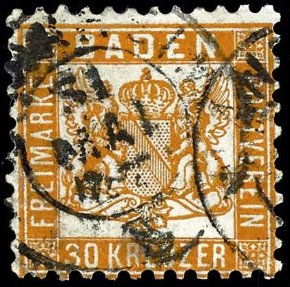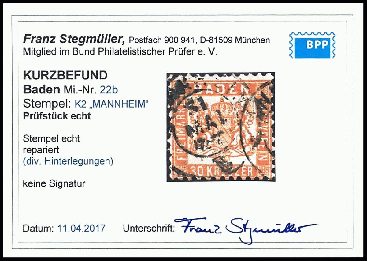 | Zusatzinformationen und Suchstichworte: | Dr. Reinhard Fischer 190. Auktion 27. - 28. Januar 2023 Los 119 Altdeutschland Baden 30 Kreuzer dunkelgelblichorange, gestempelt "MANNHEIM", repariert, Fotobefund Stegmüller BPP, Mi. 3.200.- Ausruf 350,00 EUR |