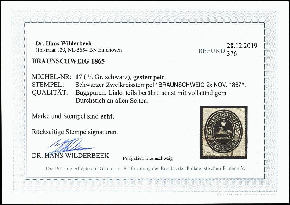 | Zusatzinformationen und Suchstichworte: | Dr. Reinhard Fischer 190. Auktion 27. - 28. Januar 2023 Los 358 Altdeutschland Braunschweig 1/2 Sgr. schwarz, farbfrisches Exemplar mit K2 "BRAUNSCHWEIG 2x NOV 1867", kleiner Eckbug rechts oben, links teils berührt, sonst vollständiger Durchstich an allen vier Seiten, Fotobefund Wilderbeek BPP (12/2019), Mi. 480.- Ausruf 50,00 EUR |