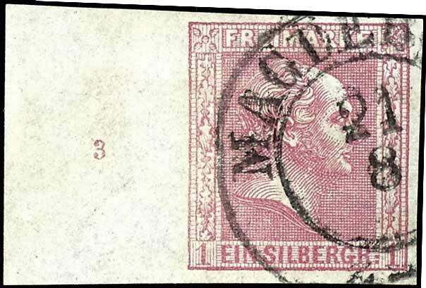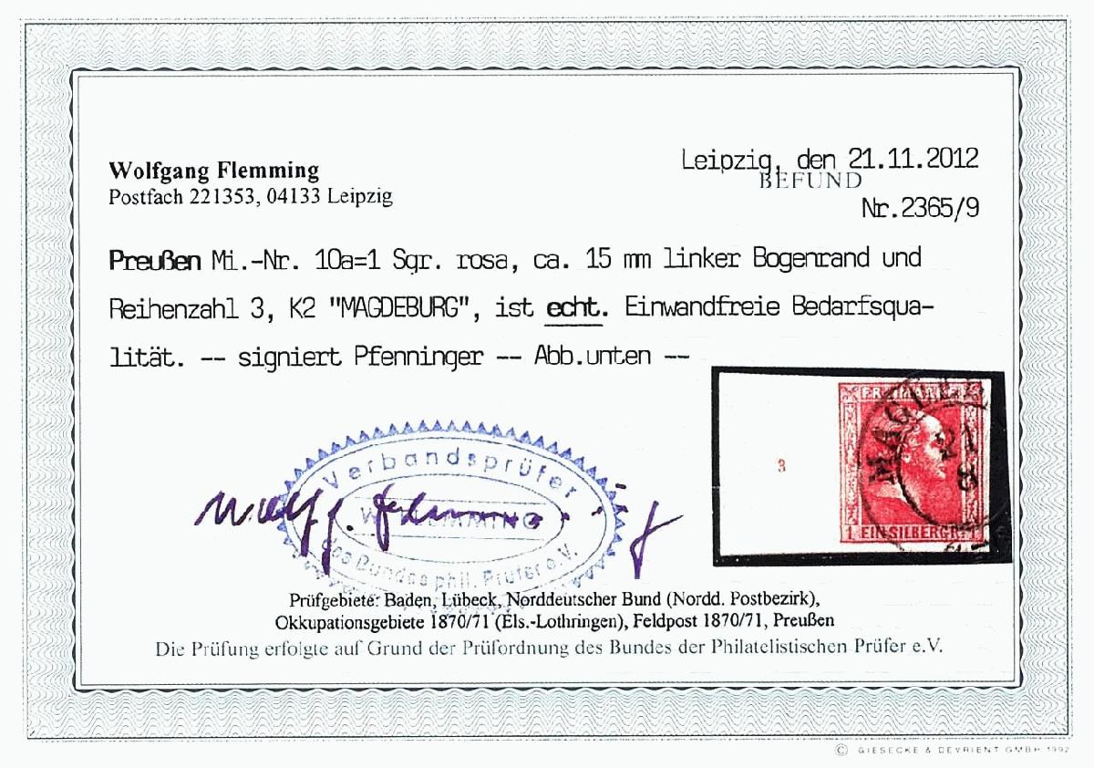 | Zusatzinformationen und Suchstichworte: | Dr. Reinhard Fischer 190. Auktion 27. - 28. Januar 2023 Los 583 Altdeutschland Preussen 1 Sgr. rosa, gegitterter Grund, allseits vollrandiges und farbfrisches Kabinettstück vom linken Bogenrand (15mm) mit Reihenzähler "3", klar entwertet mit Orts-K2 "Magdeburg 21 8" (Reg.-Bez. Magdeburg), gepr. Pfenninger und Fotobefund Flemming BPP (2012) Ausruf 150,00 EUR |