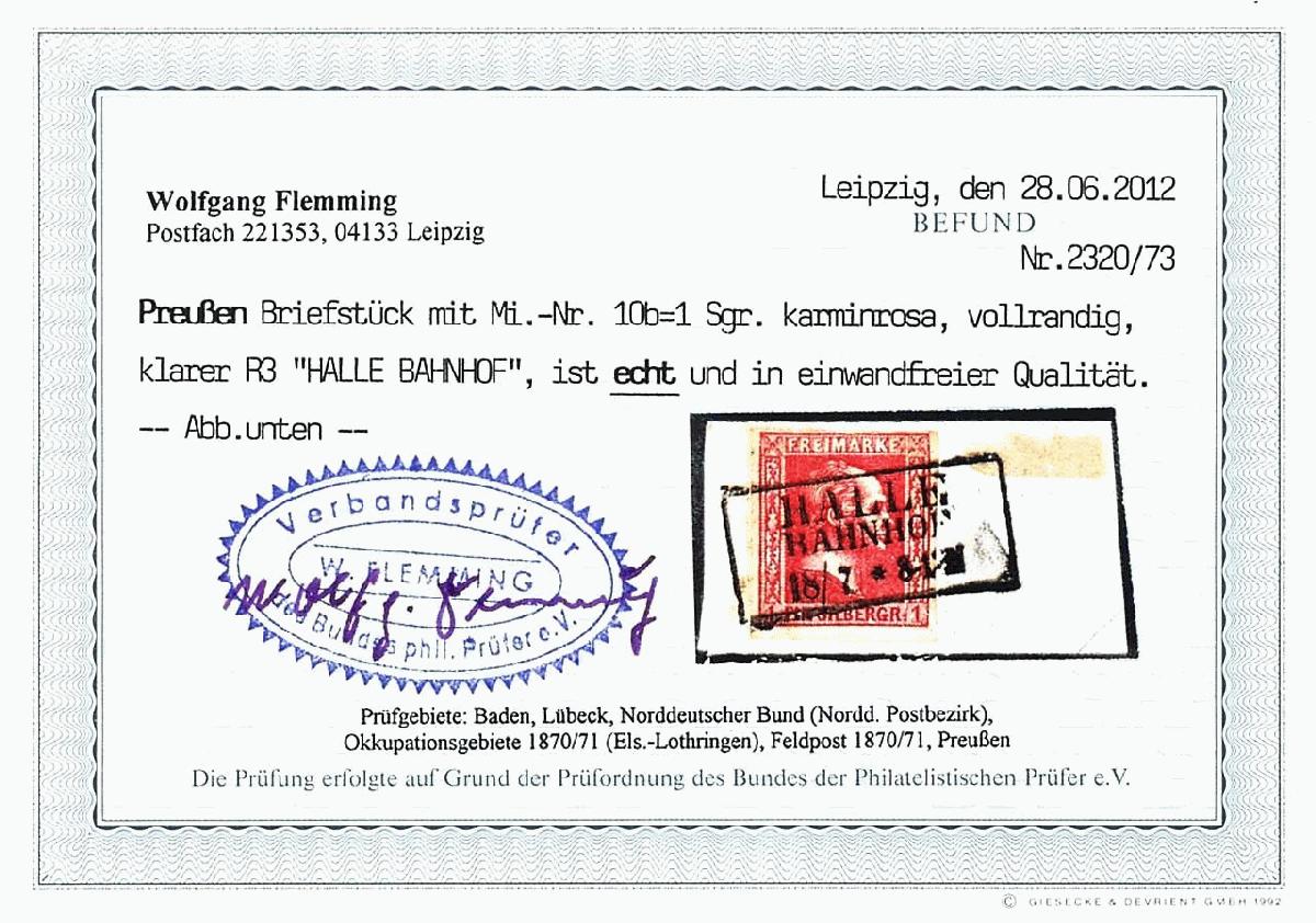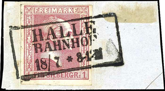 | Zusatzinformationen und Suchstichworte: | Dr. Reinhard Fischer 190. Auktion 27. - 28. Januar 2023 Los 585 Altdeutschland Preussen 1 Sgr. karminrosa, gegitterter Grund, allseits vollrandiges und farbfrisches Kabinettstück, klar entwertet mit Ra3 "HALLE BAHNHOF 18/7" (Reg.-Bez. Merseburg) auf Briefstück, Fotobefund Flemming BPP (2012): "in einwandfreier Qualität." Ausruf 30,00 EUR |