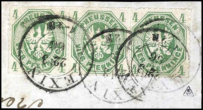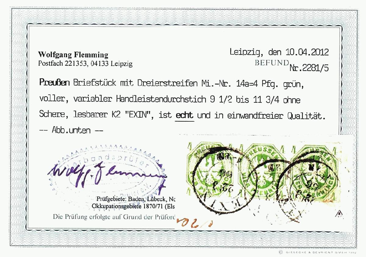 | Zusatzinformationen und Suchstichworte: | Dr. Reinhard Fischer 190. Auktion 27. - 28. Januar 2023 Los 598 Altdeutschland Preussen 4 Pfennige gelblichgrün, Adler im Achteck, waagerechter Dreierstreifen mit tadellosem Handleistendurchstich, Kabinett, klar entwertet "EXIN 22 3 66" auf Briefstück, Fotobefund Flemming BPP (2012): "echt und in einwandfreier Qualität." und Expertise Voigt VP (2019): "echt und einwandfrei" Ausruf 50,00 EUR |