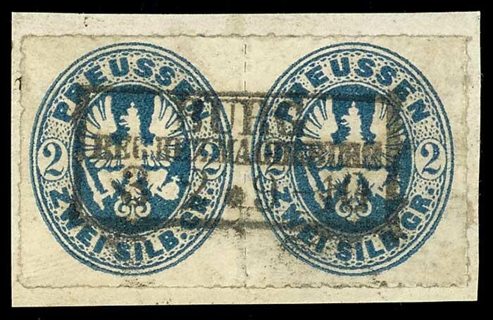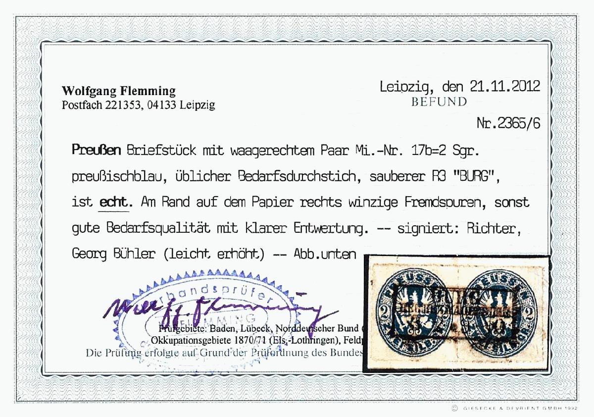 | Zusatzinformationen und Suchstichworte: | Dr. Reinhard Fischer 190. Auktion 27. - 28. Januar 2023 Los 615 Altdeutschland Preussen 2 Sgr. preußischblau, Adler im Oval, waagerechtes Paar, Pracht, entwertet mit Ra3 "BURG" auf Briefstück, Fotobefund Flemming BPP (2012) Ausruf 50,00 EUR |