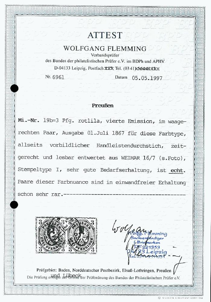 | Zusatzinformationen und Suchstichworte: | Dr. Reinhard Fischer 190. Auktion 27. - 28. Januar 2023 Los 624 Altdeutschland Preussen 3 Pfg rotlila, waagerechtes Paar, tadellos durchstochenes und farbfrisches Kabinettstück, klar entwertet "WEIMAR 16 / 7", Fotoattest Flemming BPP (1997) Ausruf 300,00 EUR |