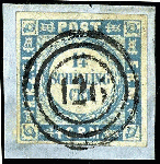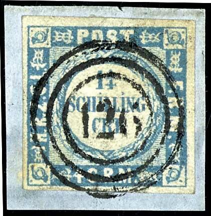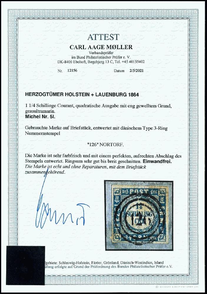 | Zusatzinformationen und Suchstichworte: | Dr. Reinhard Fischer 190. Auktion 27. - 28. Januar 2023 Los 910 Altdeutschland Schleswig Holstein 1 1/4 Schillinge grauultramarin, Type I = eng gewellter Grund, vollrandiges und farbfrisches Luxusstück mit Entwertung durch 3-Ring-Nummernstempel "126" - Nortorf auf Briefstück, Fotoattest Carl Aage Moeller BPP: "echt und einwandfrei" Ausruf 80,00 EUR |