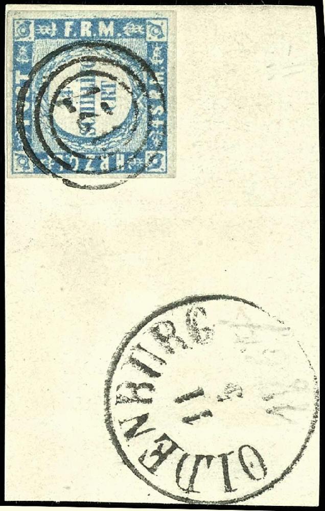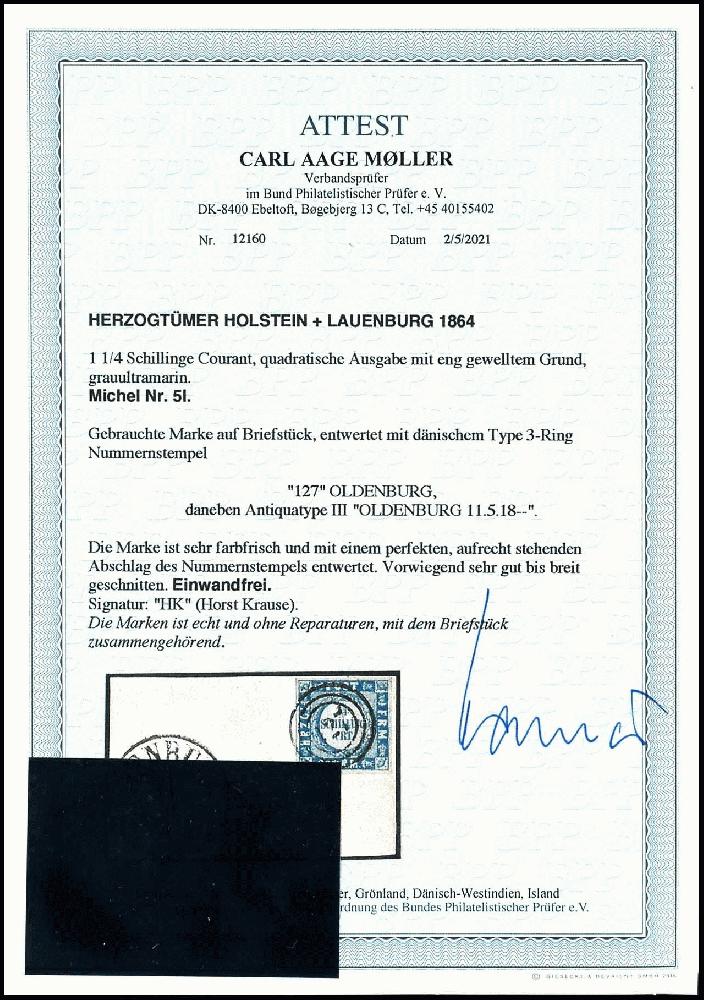 | Zusatzinformationen und Suchstichworte: | Dr. Reinhard Fischer 190. Auktion 27. - 28. Januar 2023 Los 911 Altdeutschland Schleswig Holstein 1 1/4 Schillinge grauultramarin, Type I = eng gewellter Grund, vollrandiges und farbfrisches Luxusstück mit Entwertung durch 3-Ring-Nummernstempel "127" und nebengesetzt Antiyuqtype III "Oldenburg 11.5" auf Briefstück, Fotoattest Carl Aage Moeller BPP: "echt und einwandfrei" Ausruf 80,00 EUR |