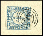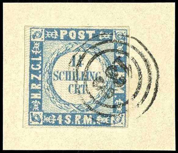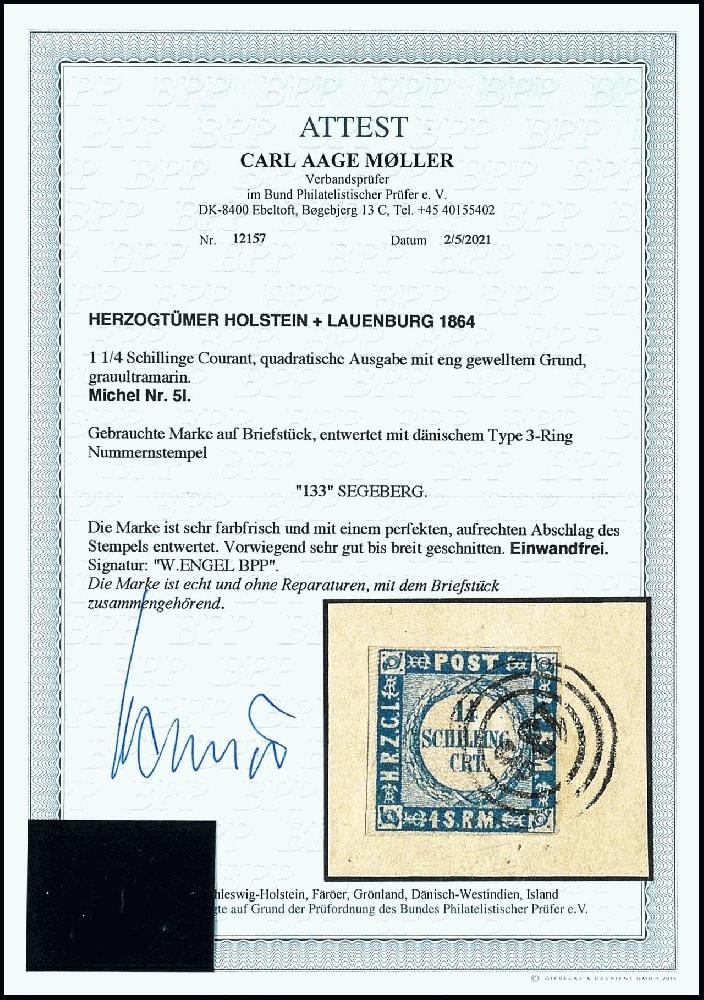 | Zusatzinformationen und Suchstichworte: | Dr. Reinhard Fischer 190. Auktion 27. - 28. Januar 2023 Los 912 Altdeutschland Schleswig Holstein 1 1/4 Schillinge grauultramarin, Type I = eng gewellter Grund, vollrandiges und farbfrisches Luxusstück, entwertet mit 3-Ring-Nummernstempel "133" - Segeberg auf Briefstück, Fotoattest Carl Aage Moeller BPP: "echt und einwandfrei" Ausruf 80,00 EUR |