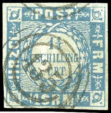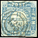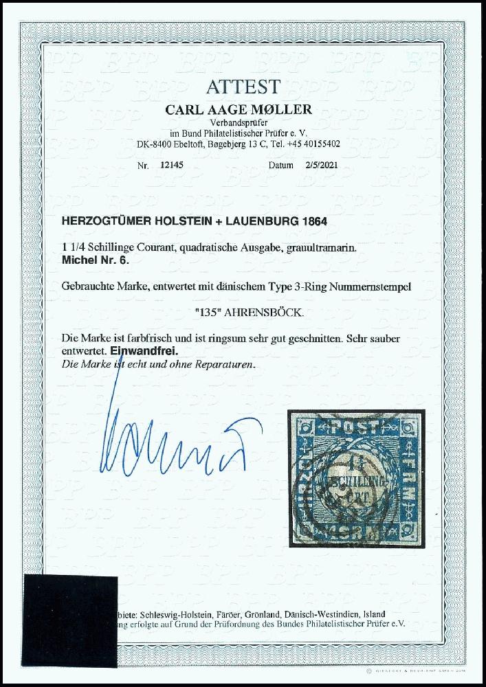 | Zusatzinformationen und Suchstichworte: | Dr. Reinhard Fischer 190. Auktion 27. - 28. Januar 2023 Los 915 Altdeutschland Schleswig Holstein 1 1/4 Schilling grauultramarin, farbfrisches und vollrandiges Kabinettstück, klar entwertet mit 3-Ring-Nummernstempel "135" - Ahrensböck, Fotoattest Carl Aage Moeller BPP: "echt und einwandfrei" Ausruf 50,00 EUR |