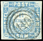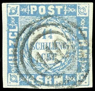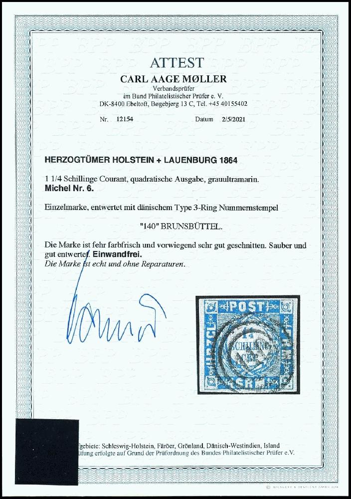 | Zusatzinformationen und Suchstichworte: | Dr. Reinhard Fischer 190. Auktion 27. - 28. Januar 2023 Los 918 Altdeutschland Schleswig Holstein 1 1/4 Schilling grauultramarin, vollrandiges und farbfrisches Kabinettstück, entwertet mit besserem 3-Ring-Nummernstempel "140" - Brunsbüttel, Fotoattest Carl Aage Moeller BPP: "echt und einwandfrei" Ausruf 70,00 EUR |