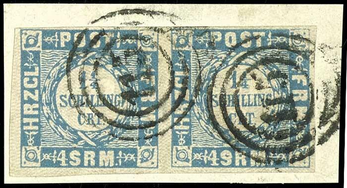 | Zusatzinformationen und Suchstichworte: | Dr. Reinhard Fischer 190. Auktion 27. - 28. Januar 2023 Los 920 Altdeutschland Schleswig Holstein 1 1/4 Schilling grauultramarin, waagerechtes Paar, farbfrisches und voll- bis breitrandig geschnittenes Kabinettstück, entwertet mit dänischem 3-Ring-Nummernstempel "115" - Eutin", Fotoattest Carl Aage Moeller BPP (2021): "Einwandfrei.", Mi. 220.- Ausruf 70,00 EUR |