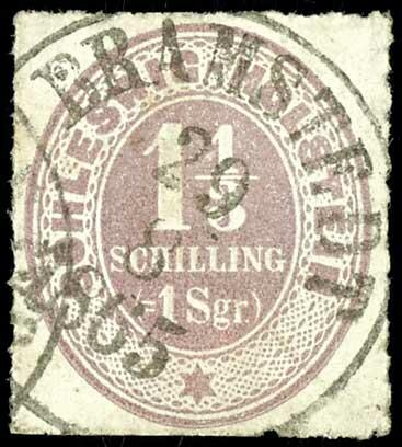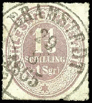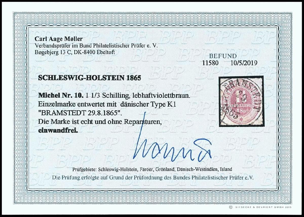 | Zusatzinformationen und Suchstichworte: | Dr. Reinhard Fischer 190. Auktion 27. - 28. Januar 2023 Los 928 Altdeutschland Schleswig Holstein 1 1/3 Schilling lebhaftviolettbraun, farbfrisches und gut durchstochenes Kabinettstück, entwertet mit K1 "Bramstedt 29 8 1865" in dänischer Type, Fotobefund Carl Aage Moeller BPP: "einwandfrei", Mi. 150.- Ausruf 60,00 EUR |
