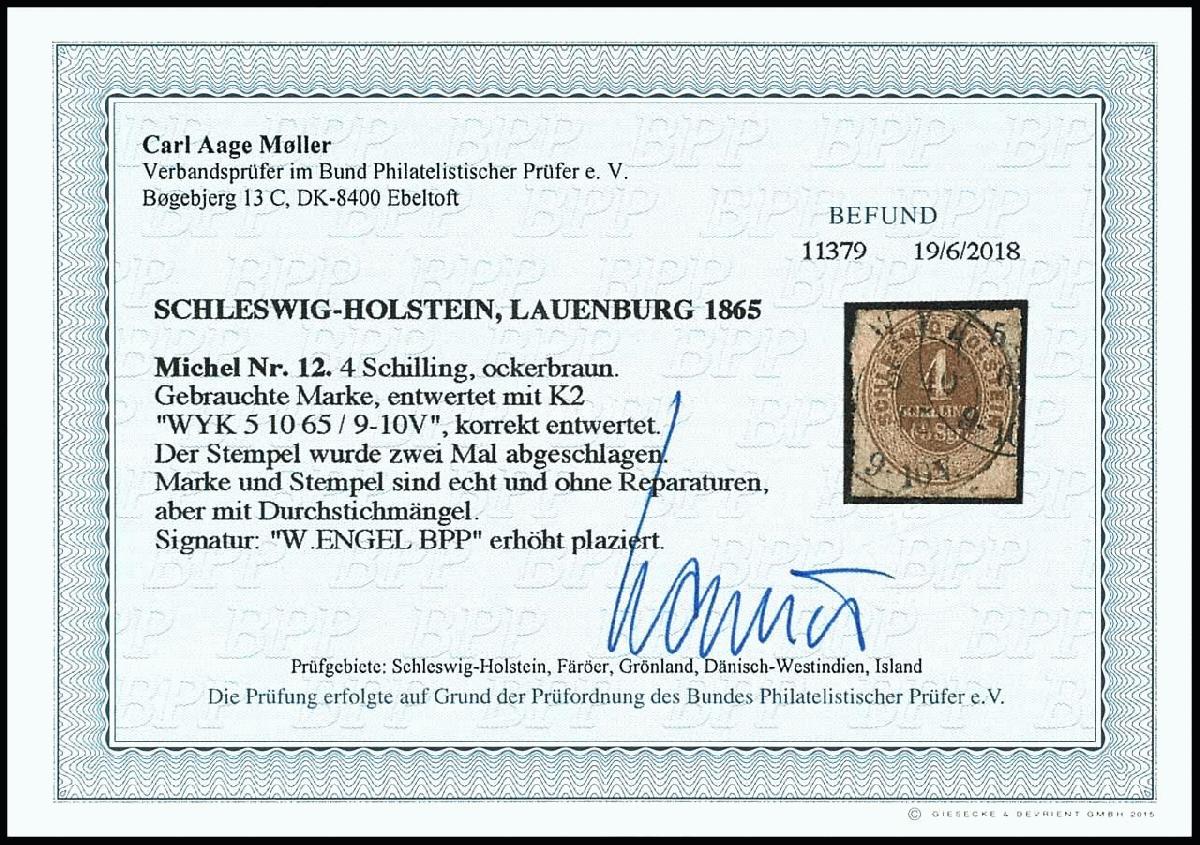 | Zusatzinformationen und Suchstichworte: | Dr. Reinhard Fischer 190. Auktion 27. - 28. Januar 2023 Los 933 Altdeutschland Schleswig Holstein 4 Schilling ockerbraun, gestempelt "WYK 5.10.65 9-10V", abgesehen von Durchstichsmängeln in sauberer Bedarfserhaltung, gepr. Engel BPP und Fotobefund Carl Aage Moeller BPP, Mi. 1.600.- Ausruf 200,00 EUR |