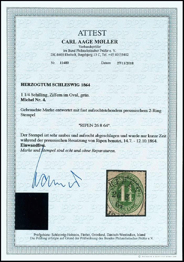| Zusatzinformationen und Suchstichworte: | Dr. Reinhard Fischer 190. Auktion 27. - 28. Januar 2023 Los 960 Altdeutschland Schleswig Holstein "RIPEN 26 8 64", K2, klar und lesbar abgeschlagen auf 1 1/4 Schilling grün, nur während der preußischen Besatzung von Ripen in der Zeit vom 14.7 - 12.10 1864 verwendet, selten, Fotoattest Carl Aage Moeller BPP: "echt und einwandfrei" Ausruf 120,00 EUR |