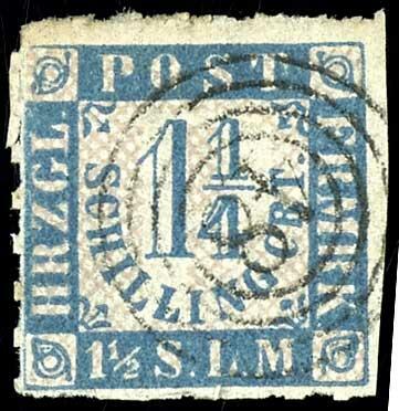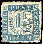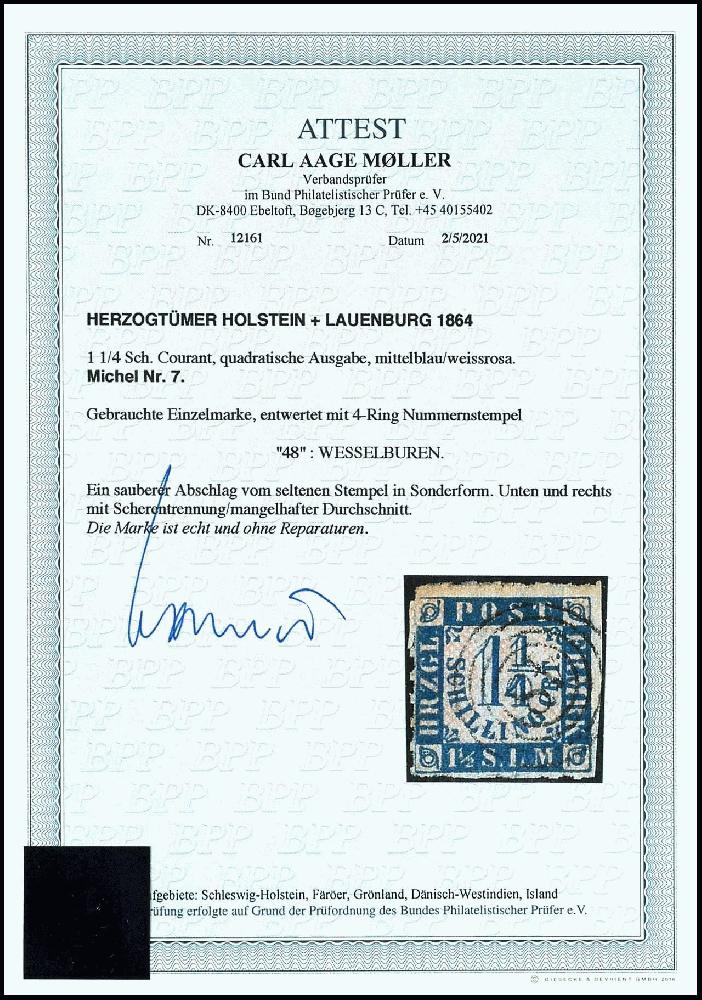 | Zusatzinformationen und Suchstichworte: | Dr. Reinhard Fischer 190. Auktion 27. - 28. Januar 2023 Los 979 Altdeutschland Schleswig Holstein "48" - Wesselburen, Vierringstempel (Sonderform), klar auf 1 1/4 Schilling mittelblau/weißrosa, unten und rechts mit Scherentrennung/mangelhafter Durchstich, Fotoattest Moeller BPP, sehr seltener Stempel, Feuser +400.- Ausruf 150,00 EUR |