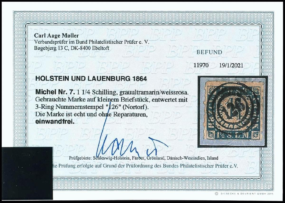 | Zusatzinformationen und Suchstichworte: | Dr. Reinhard Fischer 190. Auktion 27. - 28. Januar 2023 Los 981 Altdeutschland Schleswig Holstein "126" - Nortorf, klar und zentrisch auf 1 1/4 Schilling grauultramarin/weißrosa auf Kabinettbriefstück, Fotobefund Carl Aage Moeller BPP: "echt und einwandfrei" Ausruf 50,00 EUR |