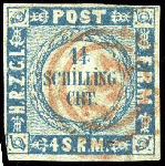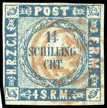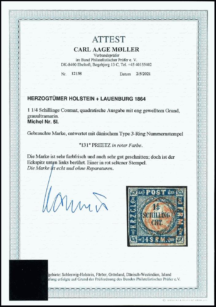 | Zusatzinformationen und Suchstichworte: | Dr. Reinhard Fischer 190. Auktion 27. - 28. Januar 2023 Los 985 Altdeutschland Schleswig Holstein "131" Preetz, in roter Farbe abgeschlagen auf 1 1/4 Schillinge grauultramarin, bis auf einen kleinen Schnittmangel unten links in fehlerfreier Erhaltung, Fotoattest Carl Aage Moeller BPP: "Ein in rot seltener Stempel" Ausruf 100,00 EUR |