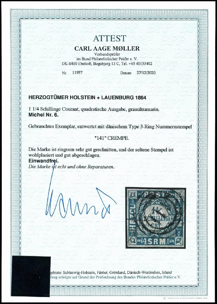 | Zusatzinformationen und Suchstichworte: | Dr. Reinhard Fischer 190. Auktion 27. - 28. Januar 2023 Los 987 Altdeutschland Schleswig Holstein "141" - Crempe, 3-Ring-Nummernstempel auf Kabinettstück 1 1/4 Schillinge grauultramarin, Fotoattest Carl Aage Moeller BPP: "echt und einwandfrei", seltener Stempel! Ausruf 120,00 EUR |