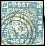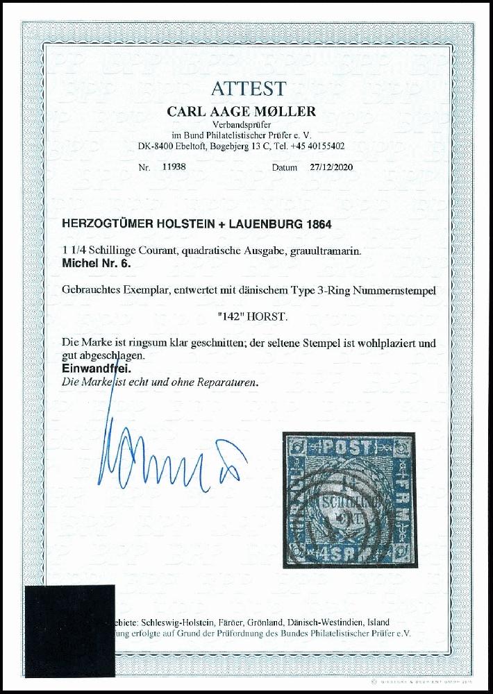 | Zusatzinformationen und Suchstichworte: | Dr. Reinhard Fischer 190. Auktion 27. - 28. Januar 2023 Los 990 Altdeutschland Schleswig Holstein "142" - Horst, 3-Ring-Nummernstempel auf Kabinettstück 1 1/4 Schillinge grauultramarin, Fotoattest Carl Aage Moeller BPP: "echt und einwandfrei", seltener Stempel! Ausruf 150,00 EUR |
