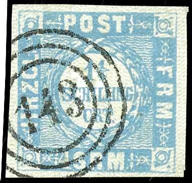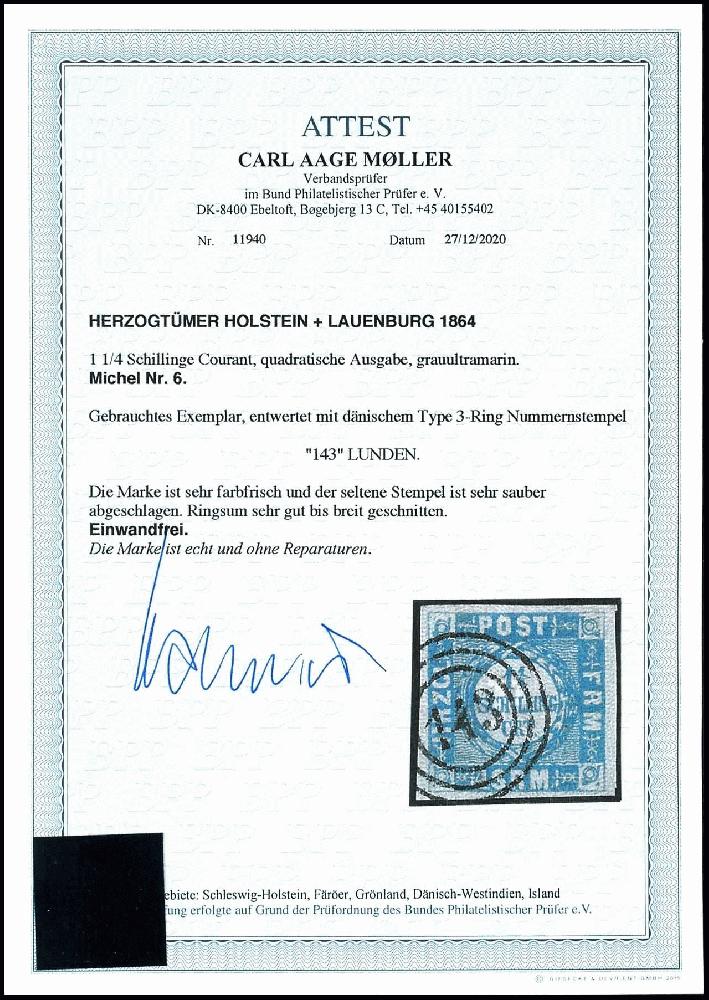 | Zusatzinformationen und Suchstichworte: | Dr. Reinhard Fischer 190. Auktion 27. - 28. Januar 2023 Los 991 Altdeutschland Schleswig Holstein "143" - Lunden, 3-Ring-Nummernstempel auf Kabinettstück 1 1/4 Schillinge grauultramarin, Fotoattest Carl Aage Moeller BPP: "echt und einwandfrei", seltener Stempel! Ausruf 100,00 EUR |