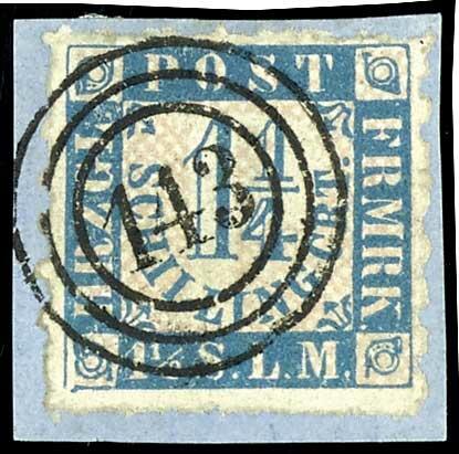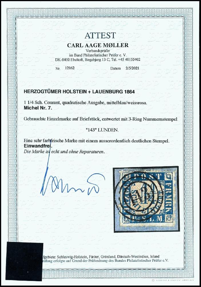 | Zusatzinformationen und Suchstichworte: | Dr. Reinhard Fischer 190. Auktion 27. - 28. Januar 2023 Los 992 Altdeutschland Schleswig Holstein "143" - Lunden, 3-Ring-Nummernstempel auf Kabinettstück 1 1/4 Schillinge mittelblau/weißrosa auf Briefstück, Fotoattest Carl Aage Moeller BPP: "echt und einwandfrei", seltener Stempel! Ausruf 80,00 EUR |