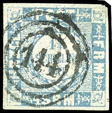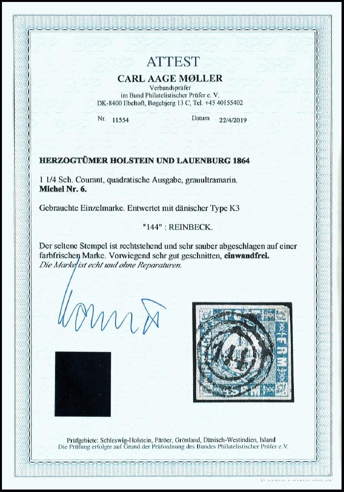 | Zusatzinformationen und Suchstichworte: | Dr. Reinhard Fischer 190. Auktion 27. - 28. Januar 2023 Los 994 Altdeutschland Schleswig Holstein "144" - Reinbeck, 3-Ring-Nummernstempel auf Kabinettstück 1 1/4 Schillinge grauultramarin, Fotoattest Carl Aage Moeller BPP: "echt und einwandfrei", seltener Stempel! Ausruf 100,00 EUR |